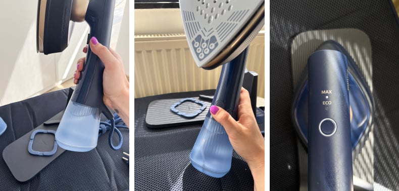 De plus, deux réservoirs d’eau sont fournis : un petit de 200 ml pour les retouches rapides et un plus grand de 300 ml pour enchaîner plusieurs vêtements. Lors de mes tests, j’ai alterné facilement entre les deux selon mes besoins.