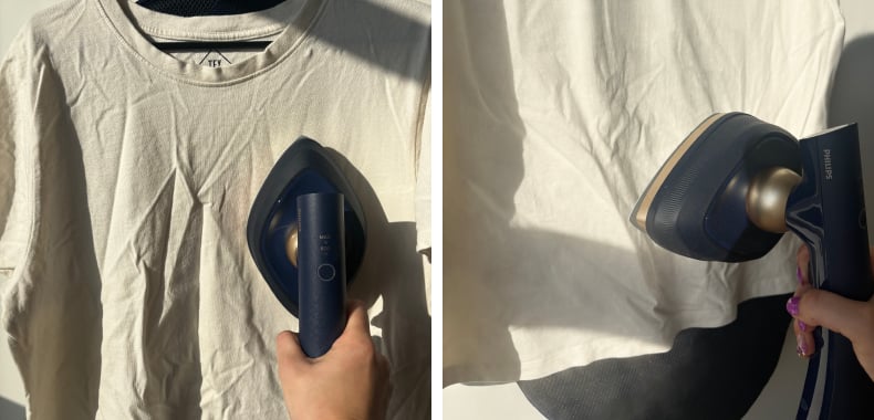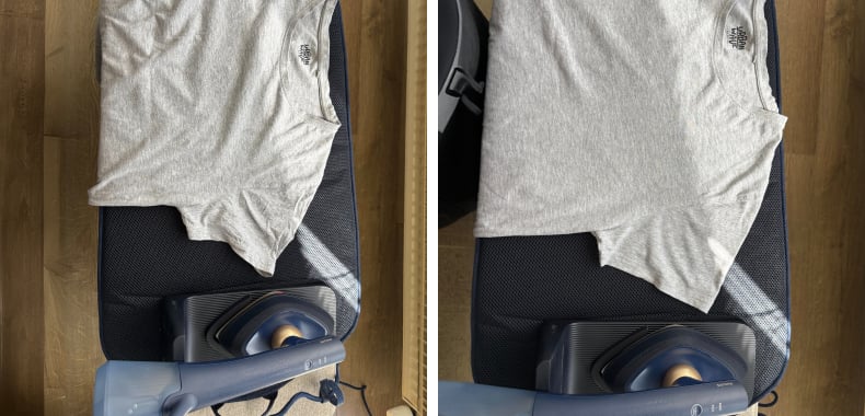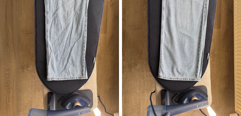 Le jean, plus épais, s’est révélé un peu plus exigeant pour un appareil aussi compact. Obtenir un résultat parfaitement lisse en une seule fois n’a pas été possible, mais les jets de vapeur puissants ont clairement amélioré le rendu. Il suffit d’appuyer sur un bouton pour les activer, ce qui rend l’ensemble du processus plus rapide et plus agréable.