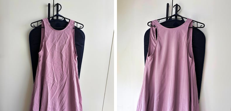 Pour une robe en satin, j’ai adopté une autre approche. Je l’ai suspendue à un porte-manteau et placé le tapis de repassage derrière pour un meilleur soutien. En retournant l’embout du OneTurn, j’ai utilisé la fonction vapeur, ce qui a permis d’éliminer immédiatement de nombreux plis. J’ai ensuite finalisé avec le mode repassage, de manière fluide et maîtrisée.
