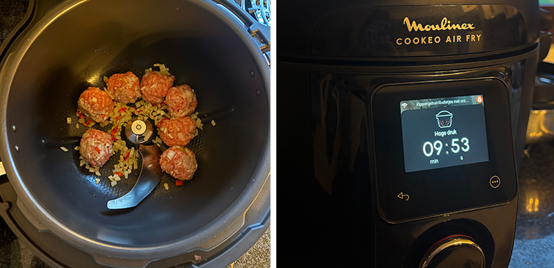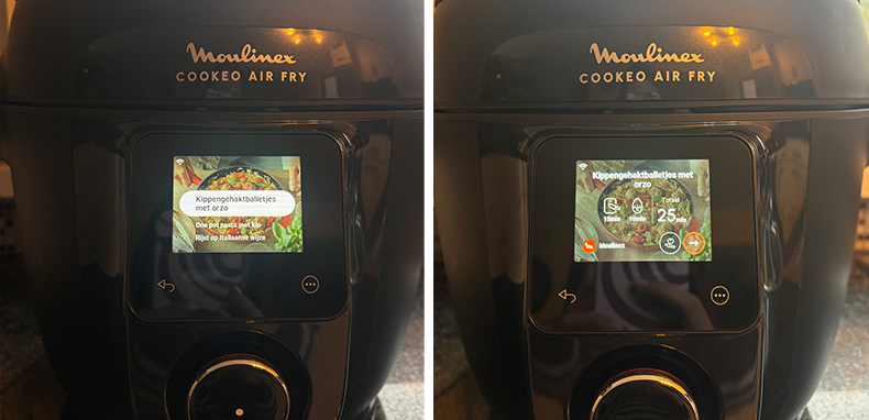 De CookeoInfinity werkt samen met de My Moulinex-app, waarin je duizenden recepten vindt. Ik koppelde de app aan het toestel, koos een gerecht en vanaf dan nam de Cookeo het werk over. Op het scherm verschijnen duidelijke instructies en het toestel past automatisch de tijd en de temperatuur aan elke stap aan. Ik koos voor kippengehaktballetjes met orzo: alle stappen waren eenvoudig te volgen. Het voorverwarmen duurde soms wat langer, maar je kunt het toestel gerust alleen laten. Ideaal voor wie weinig tijd heeft en toch een complete, verse maaltijd wil.